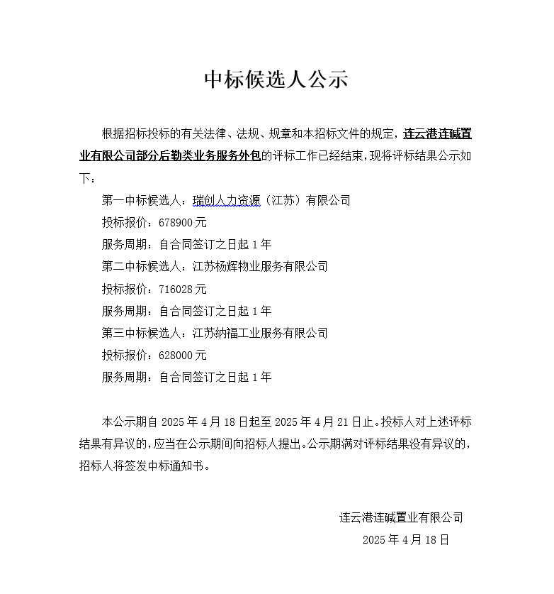 連云港連堿置業(yè)有限公司部分后勤類(lèi)業(yè)務(wù)服務(wù)外包中標(biāo)候選人公示