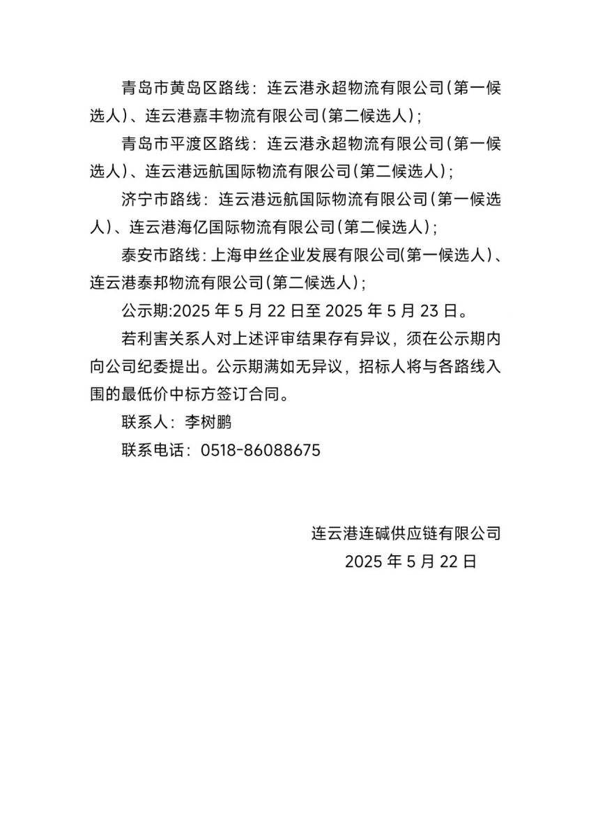 連云港連堿供應鏈有限公司純堿、氯化銨等汽車專線運輸項目評標結果公示
