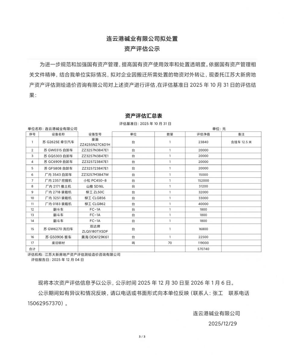 連云港堿業有限公司廢舊車輛、鋼材資產評估公示