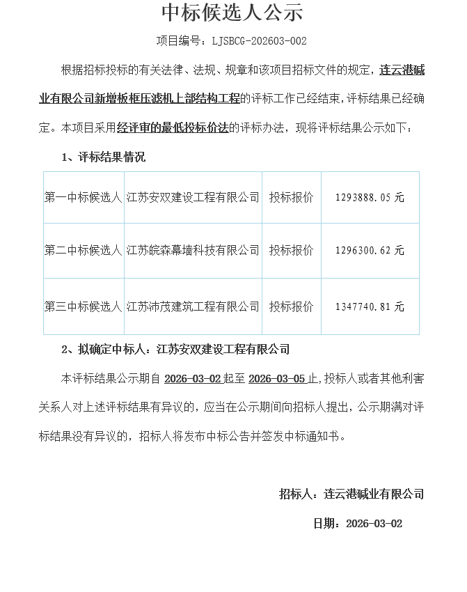 連云港堿業有限公司新增板框壓濾機上部結構工程中標候選人公示