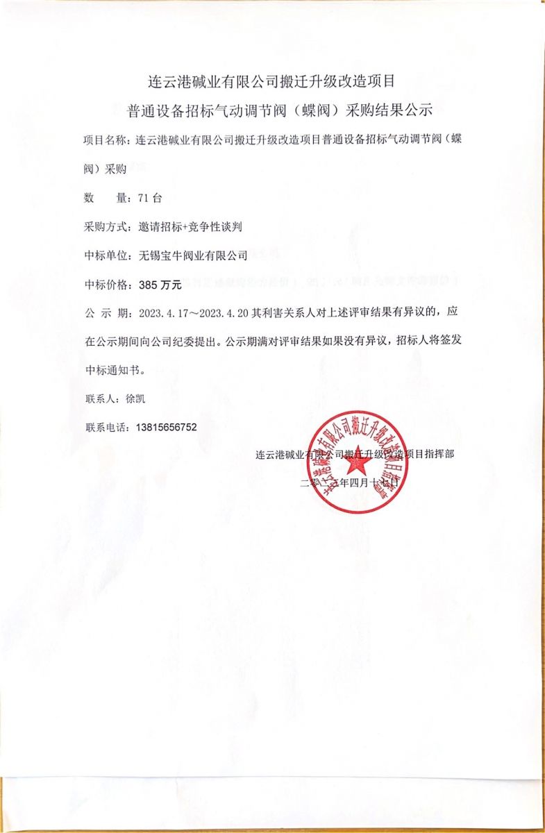 氣動調節閥(蝶閥)采購結果公示