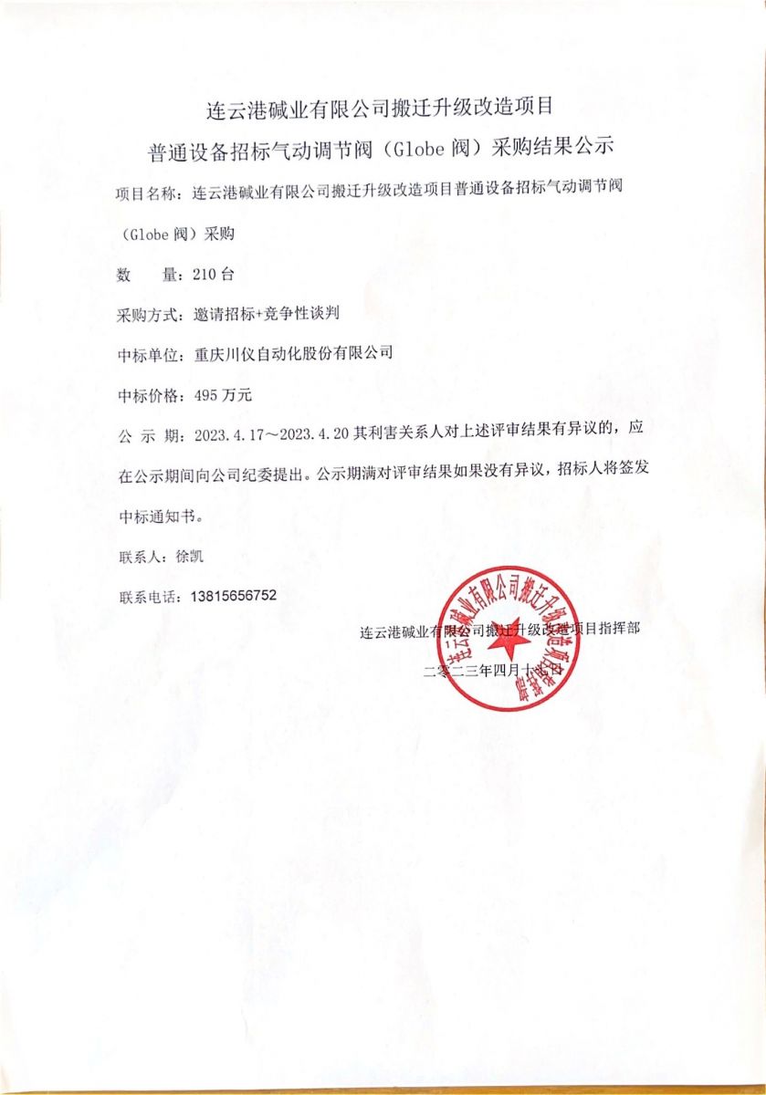 氣動調節閥(Globe閥)采購結果公示