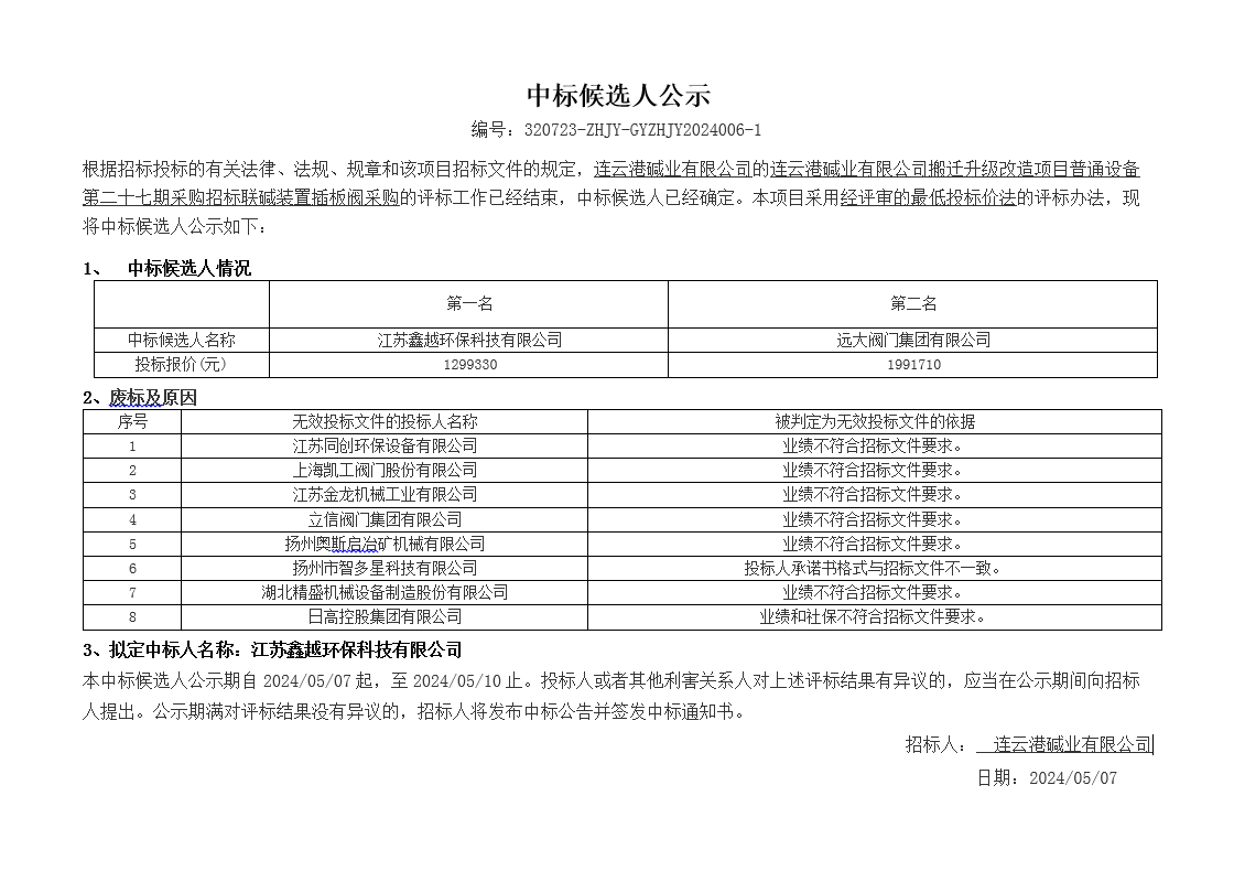 搬遷升級改造項目普通設(shè)備第二十七期采購招標聯(lián)堿裝置插板閥采購中標候選人公示