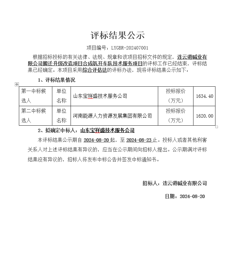 搬遷升級(jí)改造項(xiàng)目合成氨開車隊(duì)技術(shù)服務(wù)項(xiàng)目評(píng)標(biāo)結(jié)果公示