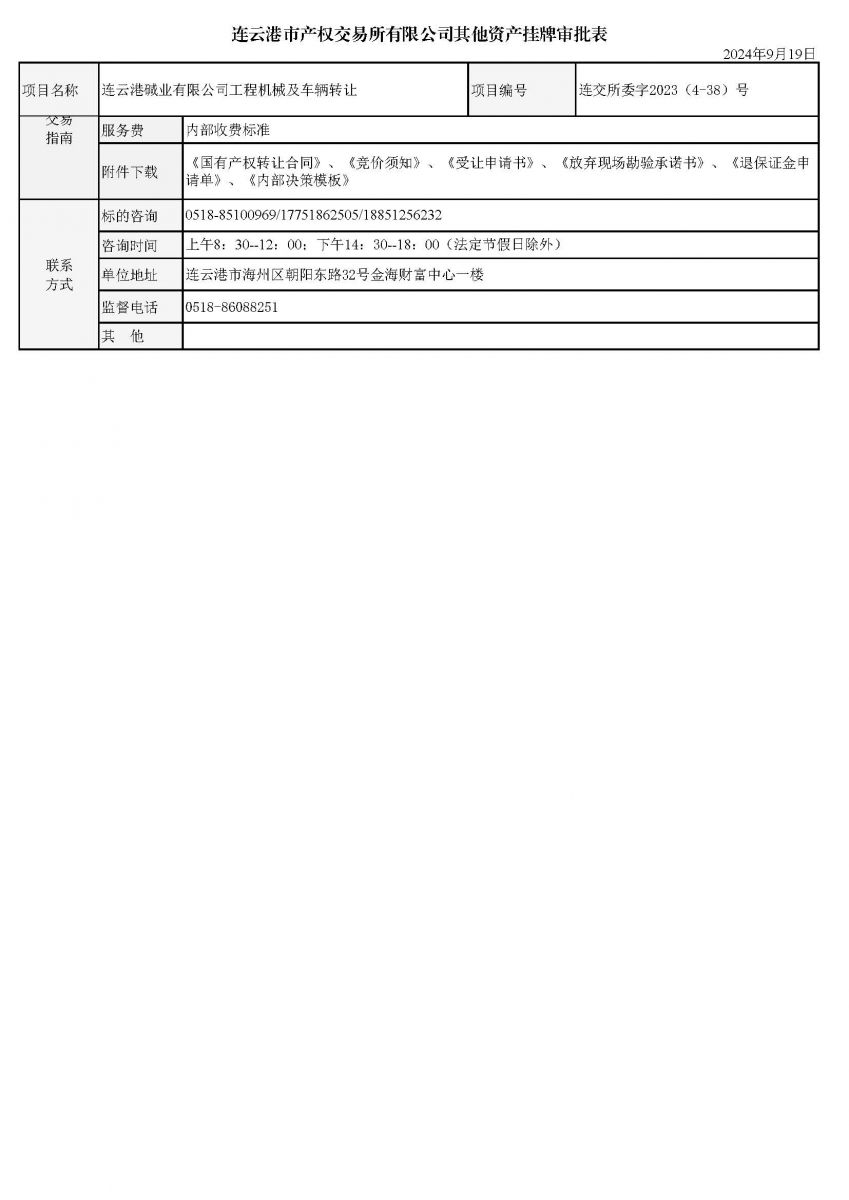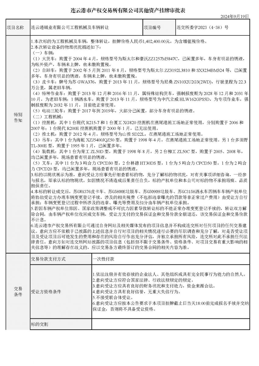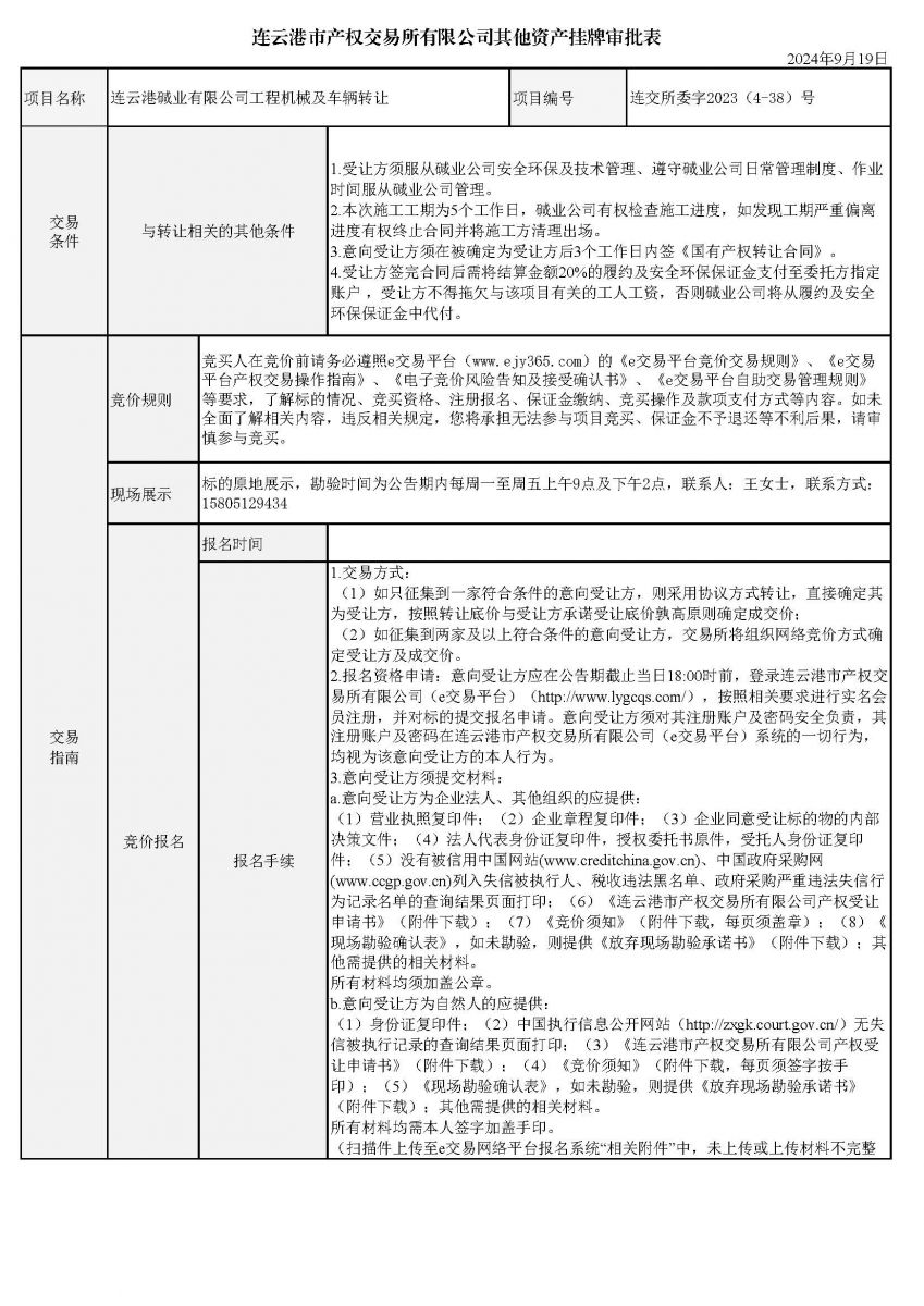 連云港堿業有限公司工程機械及車輛轉讓資產掛牌審批表