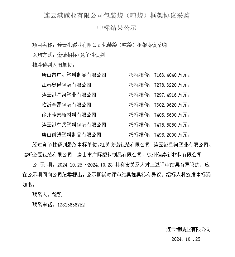 連云港堿業有限公司包裝袋(噸袋)框架協議采購中標結果公示